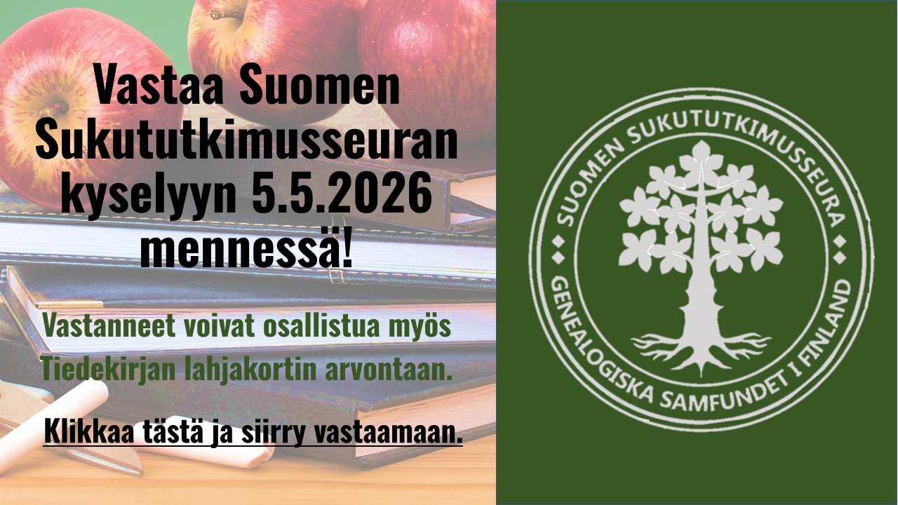 Kevään jäsen- ja käyttäjäkyselyssä Suomen Sukututkimusseura haluaa kartoittaa Seuran palvelujen käyttöä, käytettävyyttä, kehittämistä ja tunnettavuutta. Kyselyyn voivat vastata jäsenten lisäksi kaikki Seuran digitaalisia palveluja käyttävät ja niistä kiinnostuneet. Kysely on avoinna 5.5.2026 asti.