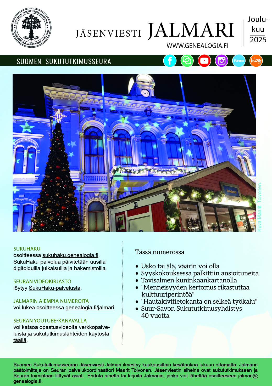 Suomen Sukututkimusseuran Henkikirjahakuun on lisätty joulukuussa noin 37 000 uutta tietuetta 13 eri paikkakunnalta vuoden 1915 henkikirjoista. Lisäyksiä ovat saaneet: Enonkoski, Haukivuori, Jäppilä, Joroinen, Kylmäkoski, Lappajärvi, Pieksämäki, Prunkkala (Aura), Puumala, Salon kauppala, Uskela, Vilppula ja Virtasalmi.