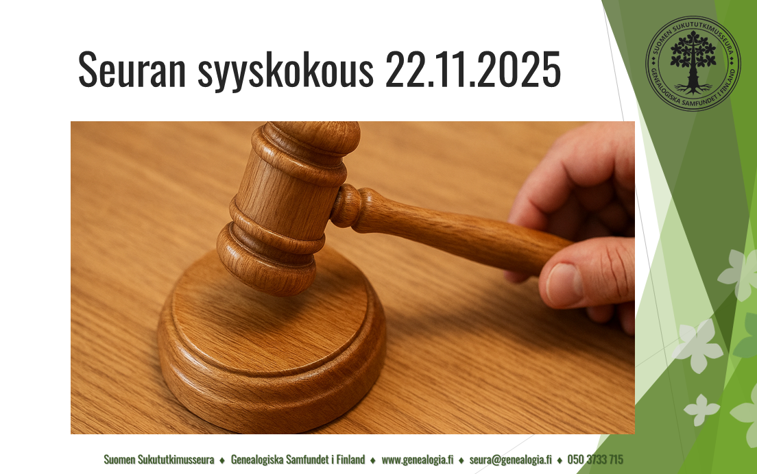 Suomen Sukututkimusseuran syyskokous pidetään lauantaina 22.11.2025 klo 10.00 alkaen Tieteiden talolla (Kirkkokatu 6, Helsinki).