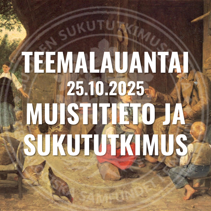 Syksyn Teemalauantaita vietetään lauantaina 25.10.2025 klo 10.00–13.00 ja sen aiheena on "Muistitieto ja sukututkimus". Suvun piirissä kerrotut kertomukset ovat tärkeitä sukututkimuksen lähteitä. Teemalauantaina paneudutaan muistitiedon tuottamisen periaatteisiin ja sen käyttöön lähteenä. Lisäksi perehdytään arkistoissa...