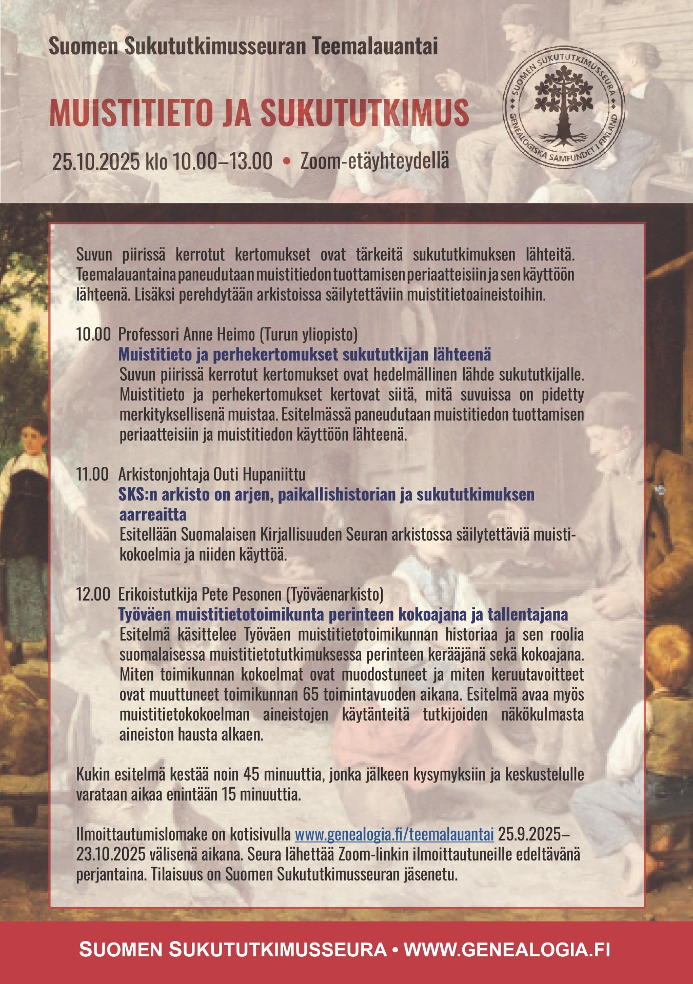 Syksyn 2025 Teemalauantai pidettiin etäyhteydellä 25.10.2025. Teemana oli "Muistitieto ja sukututkimus". Suvun piirissä kerrotut kertomukset ovat tärkeitä sukututkimuksen lähteitä. Teemalauantain esitelmissä paneuduttiin muistitiedon tuottamisen periaatteisiin ja sen käyttöön lähteenä, sekä arkistoissa säilytettäviin muistitietoaineistoihin.